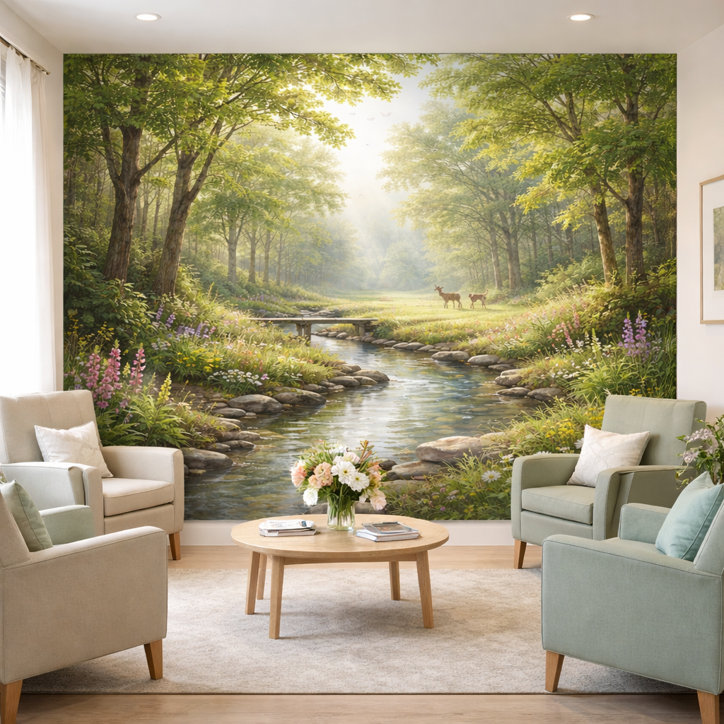 This is bespoke wallpaper, custom made exactly to your wall measurements. A peaceful forest stream...