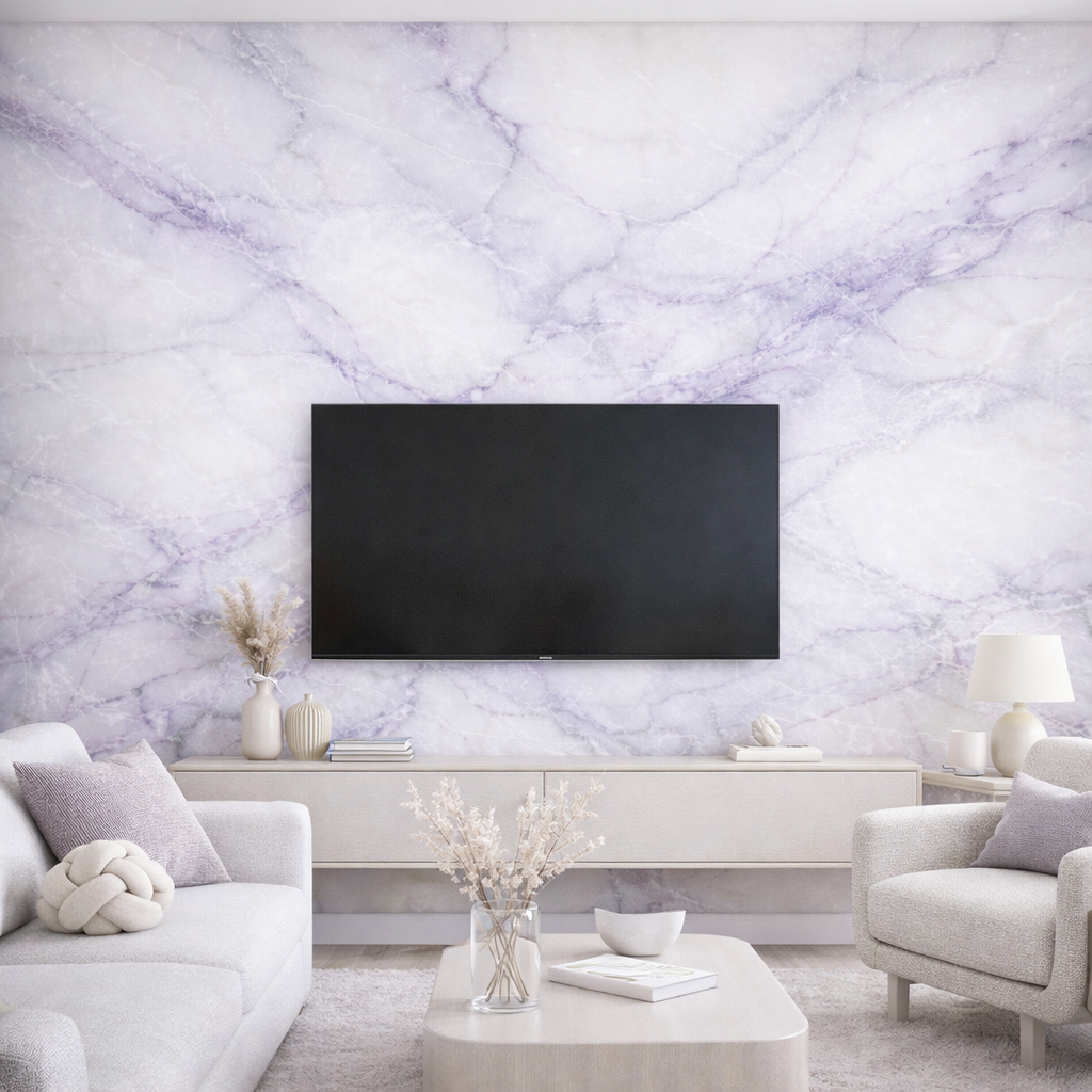This is bespoke wallpaper, custom made to your exact wall measurements. Soft lavender marble flows...
