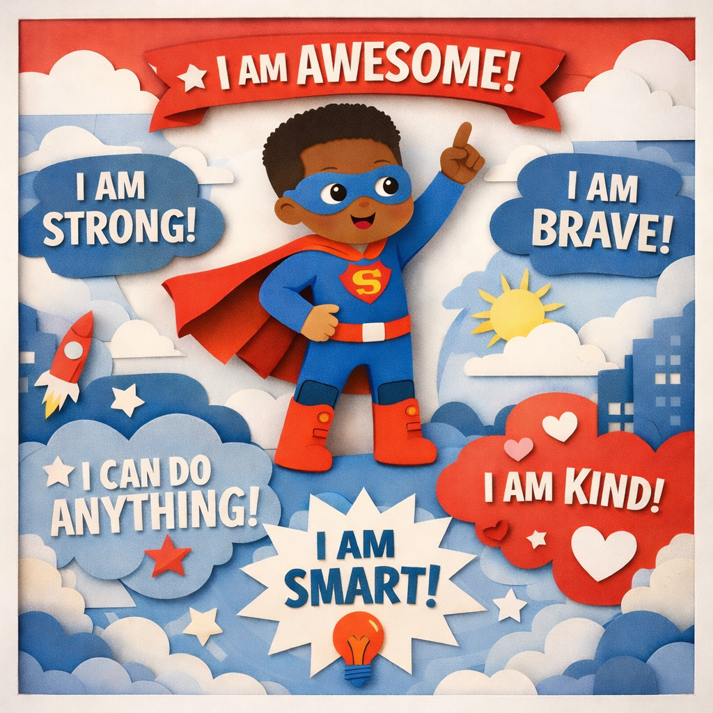 With bold affirmations like “I am strong” and “I am brave,” this uplifting superhero design gently trains your child’s inner voice to be confident, kind, and resilient.