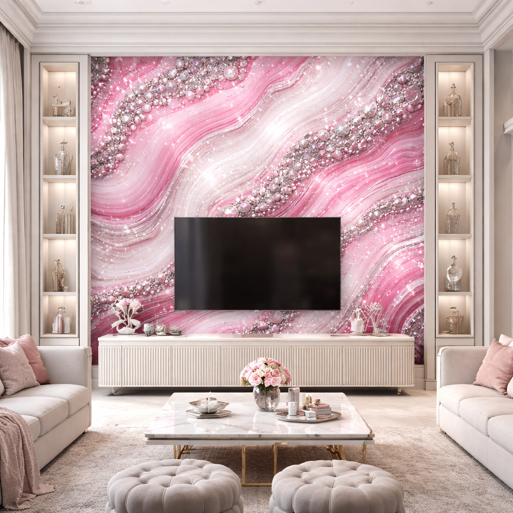Soft blush tones flow through elegant marble waves, finished with shimmering crystal accents that catch the light beautifully. This luxury design transforms walls into statement features, bringing glamour, depth, and refined elegance into any space.