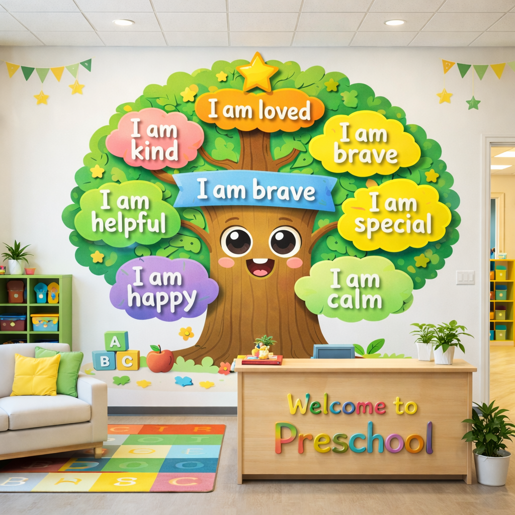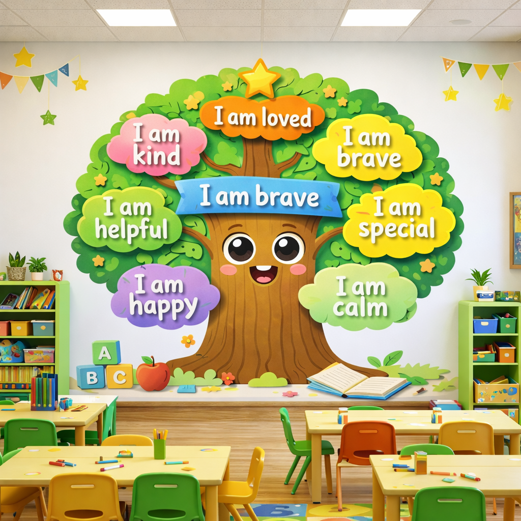 Every morning, a child wakes up and sees a smiling tree whispering powerful words: I am kind. I am brave. I am loved.