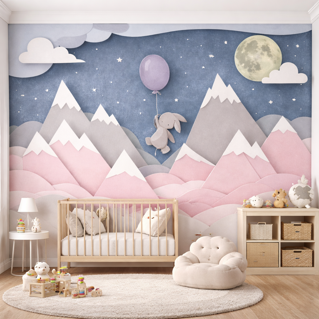 A gentle bunny floating under the moon across blush pink mountains creates a calm, magical space perfect for nurseries, pre-schools, children’s bedrooms, learning corners, soft play areas and luxury family hotels.