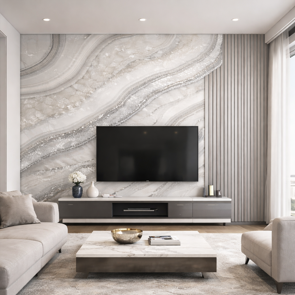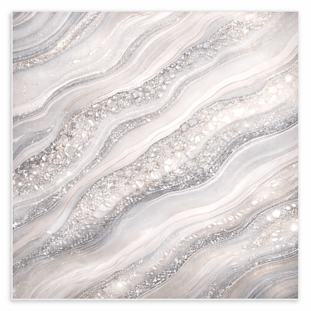 This design blends soft marble tones with shimmering crystal-like veins, creating depth, elegance, and quiet drama.