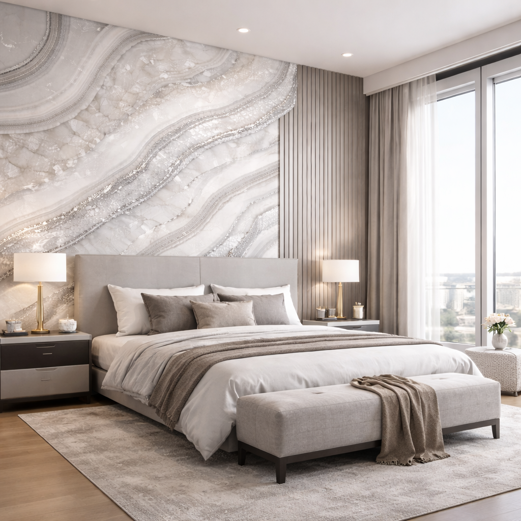 Perfect for luxury homes, boutique hotels, high-end apartments, spa interiors, executive offices, and showroom feature walls, it delivers a calm yet opulent atmosphere that feels timeless and exclusive.