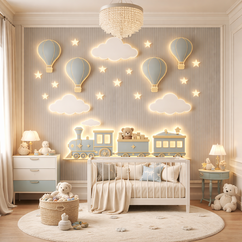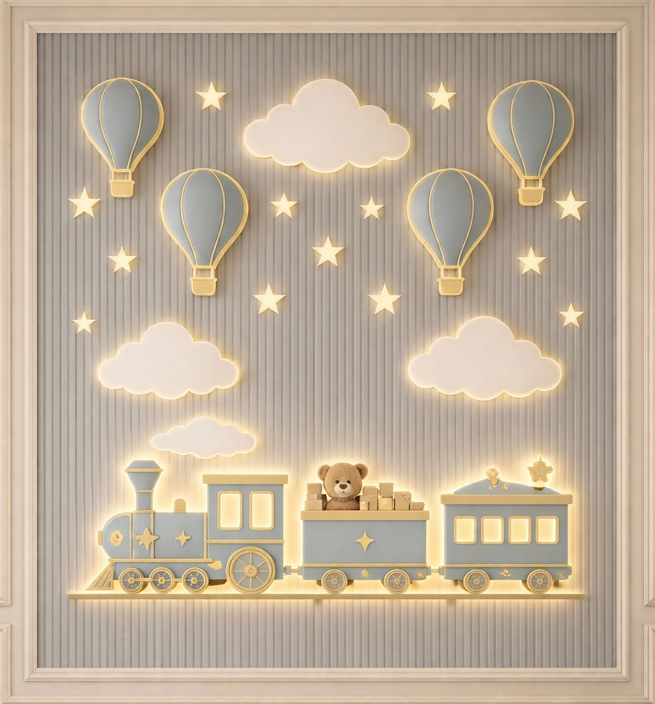 Transform your walls into a magical sky journey instead. Soft glowing hot air balloons, dreamy clouds and a charming blue train with a teddy passenger create a calming, imaginative world children love.