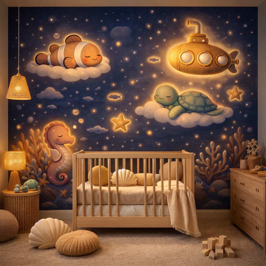 This magical underwater night scene features a sleepy clownfish, glowing submarine, peaceful turtle and warm golden coral under twinkling stars. Perfect for nurseries, preschools, children’s bedrooms, learning corners, soft play spaces and boutique family hotels.