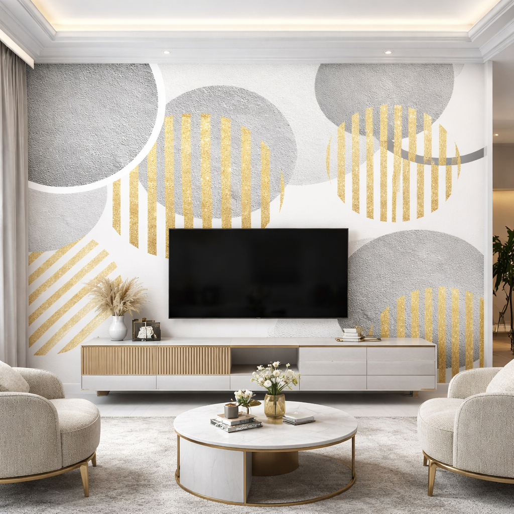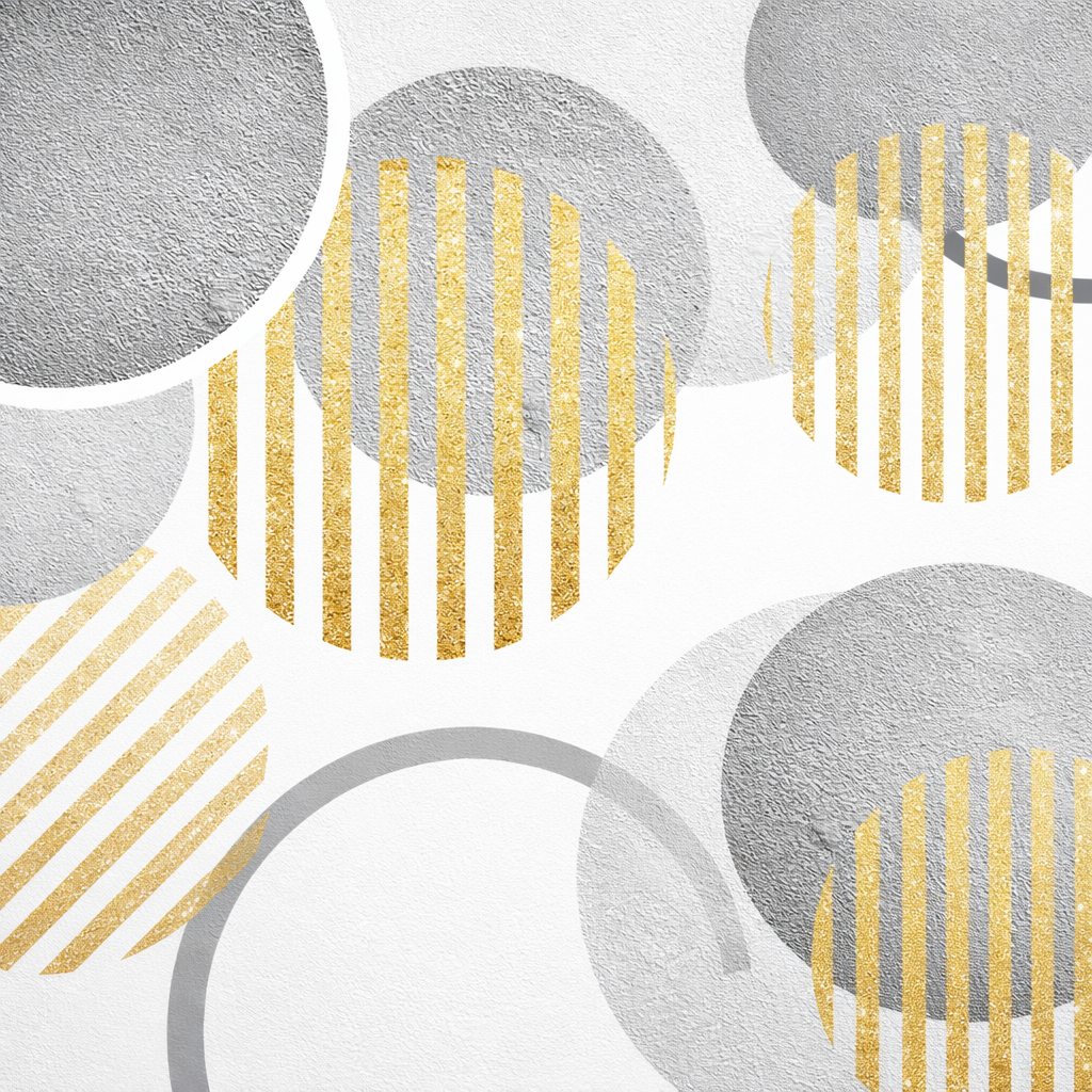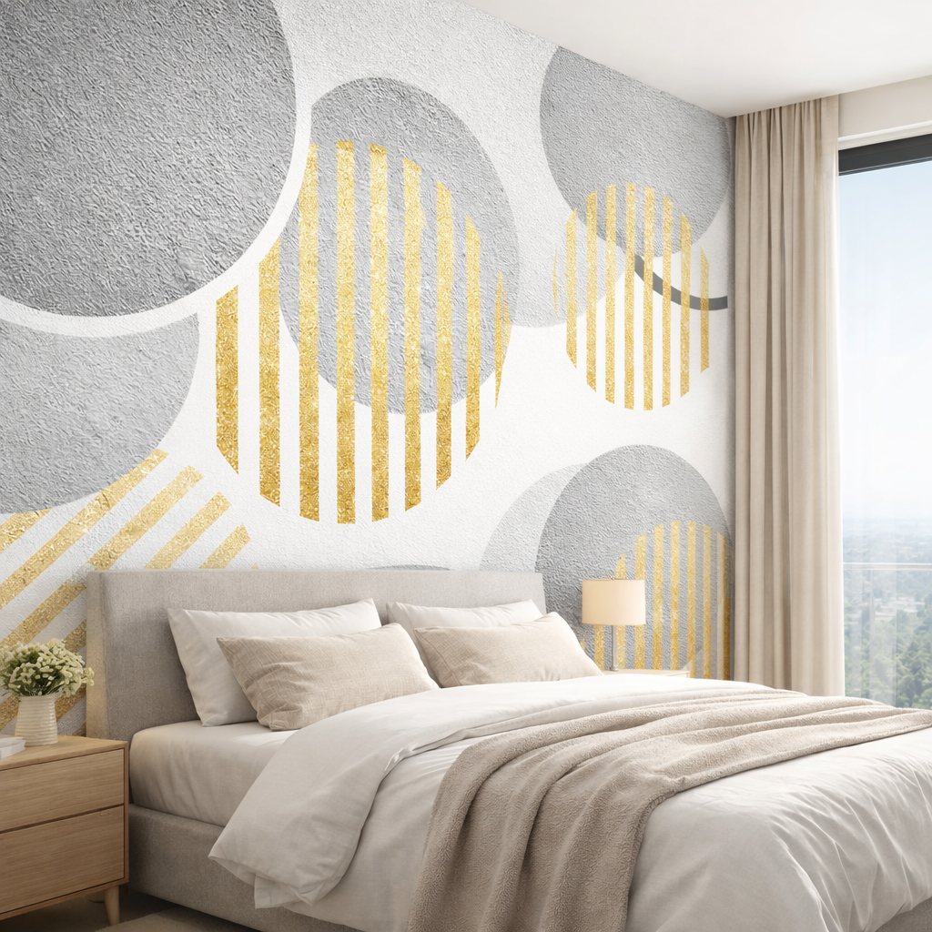 Elevate your space with Gilded Harmony, a refined abstract wallpaper that blends soft concrete greys with shimmering gold textures. The overlapping circular forms create balance, movement, and understated glamour — perfect for interiors that demand elegance without excess.