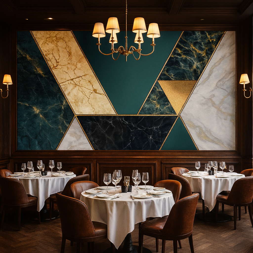Bold geometry meets refined luxury in this striking mural design. Rich emerald tones, dramatic black marble, soft ivory stone and brushed gold accents come together to create a statement of confidence and sophistication. Designed to command attention without overwhelming a space, this mural transforms walls into architectural art.