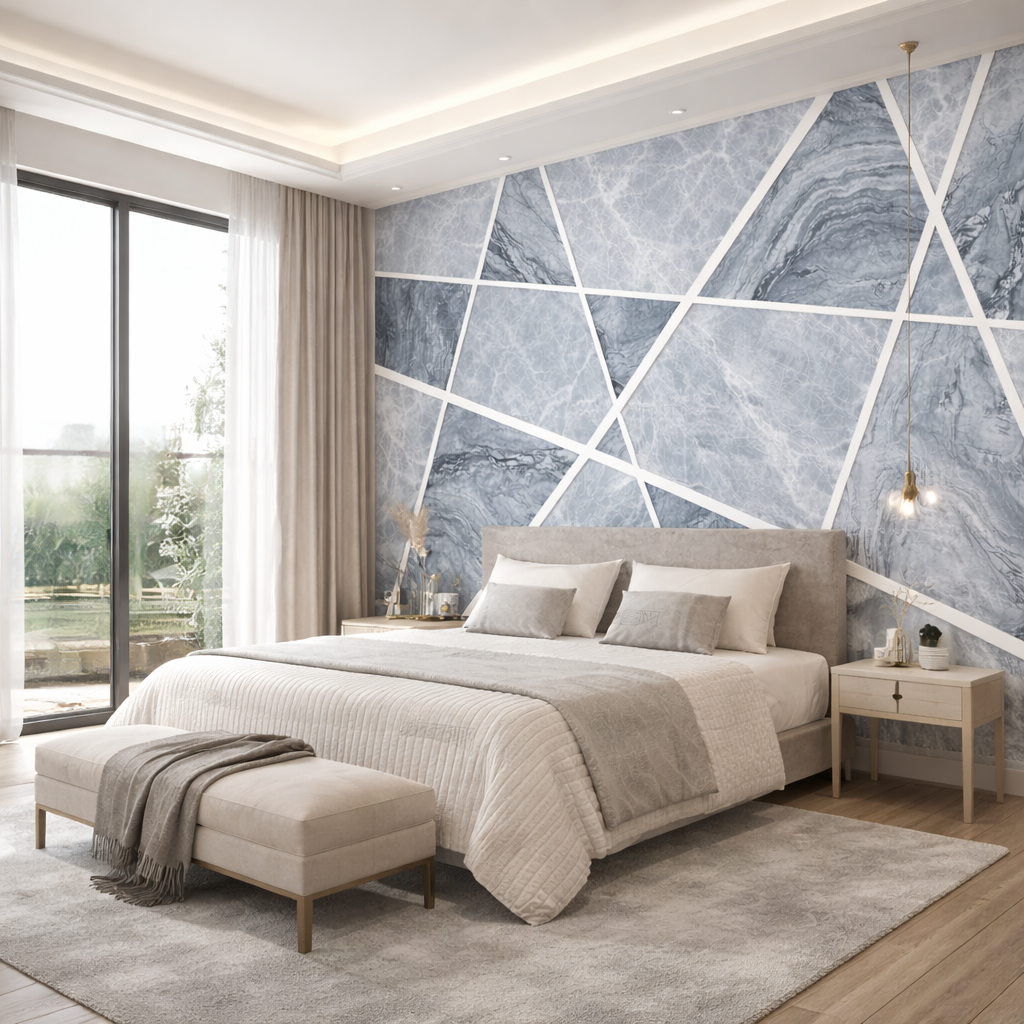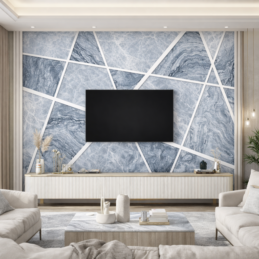 A striking fusion of cool marble textures and sharp geometric lines, this modern wallpaper mural delivers instant sophistication. The layered stone effect paired with crisp white angles creates depth, movement, and a clean architectural feel — perfect for spaces that demand understated luxury.