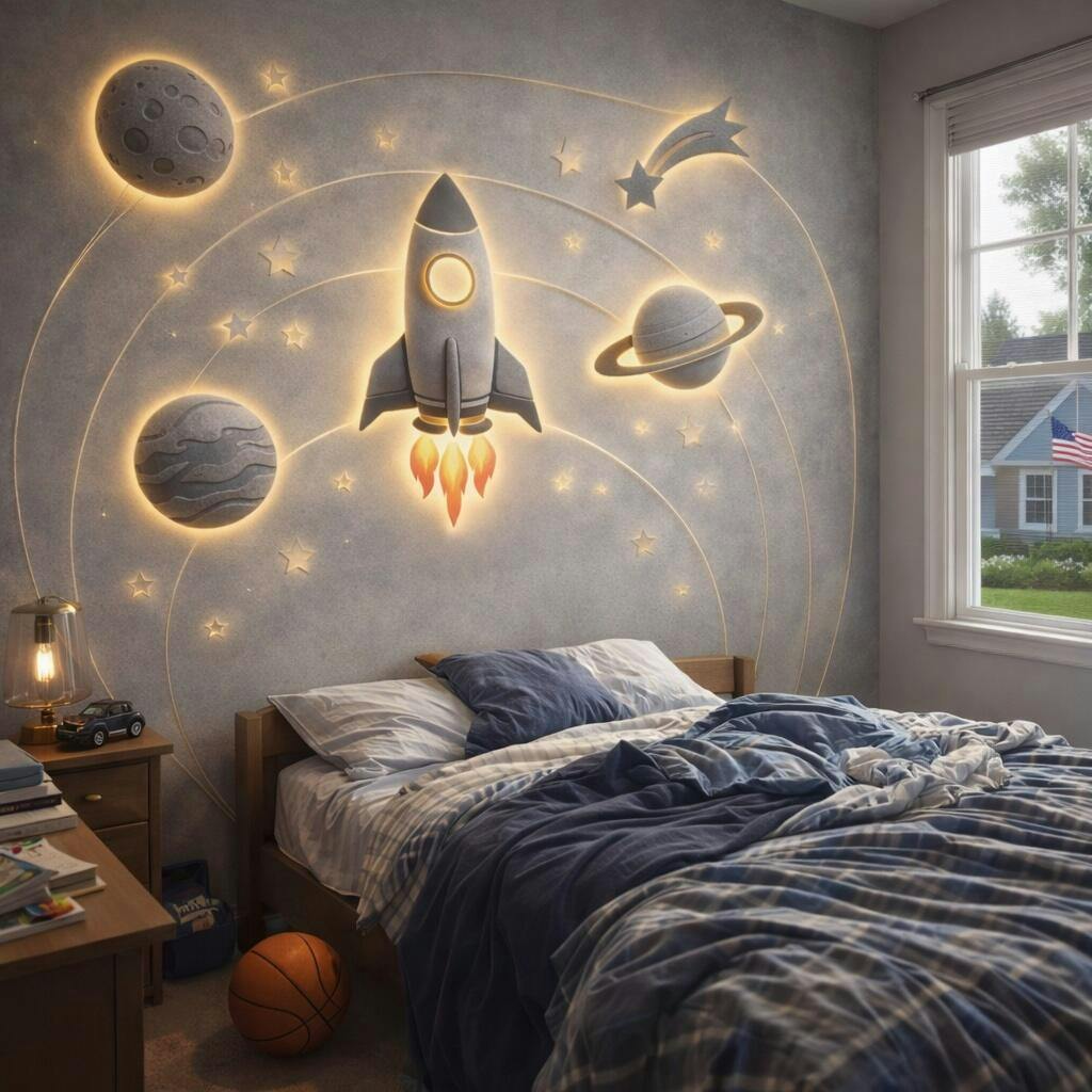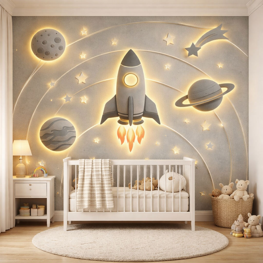 This glowing rocket and planet design brings calm, wonder and imagination into nurseries, bedrooms, early years classrooms, soft play areas and even luxury family hotel spaces.