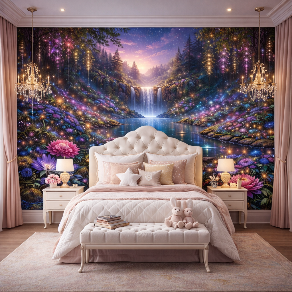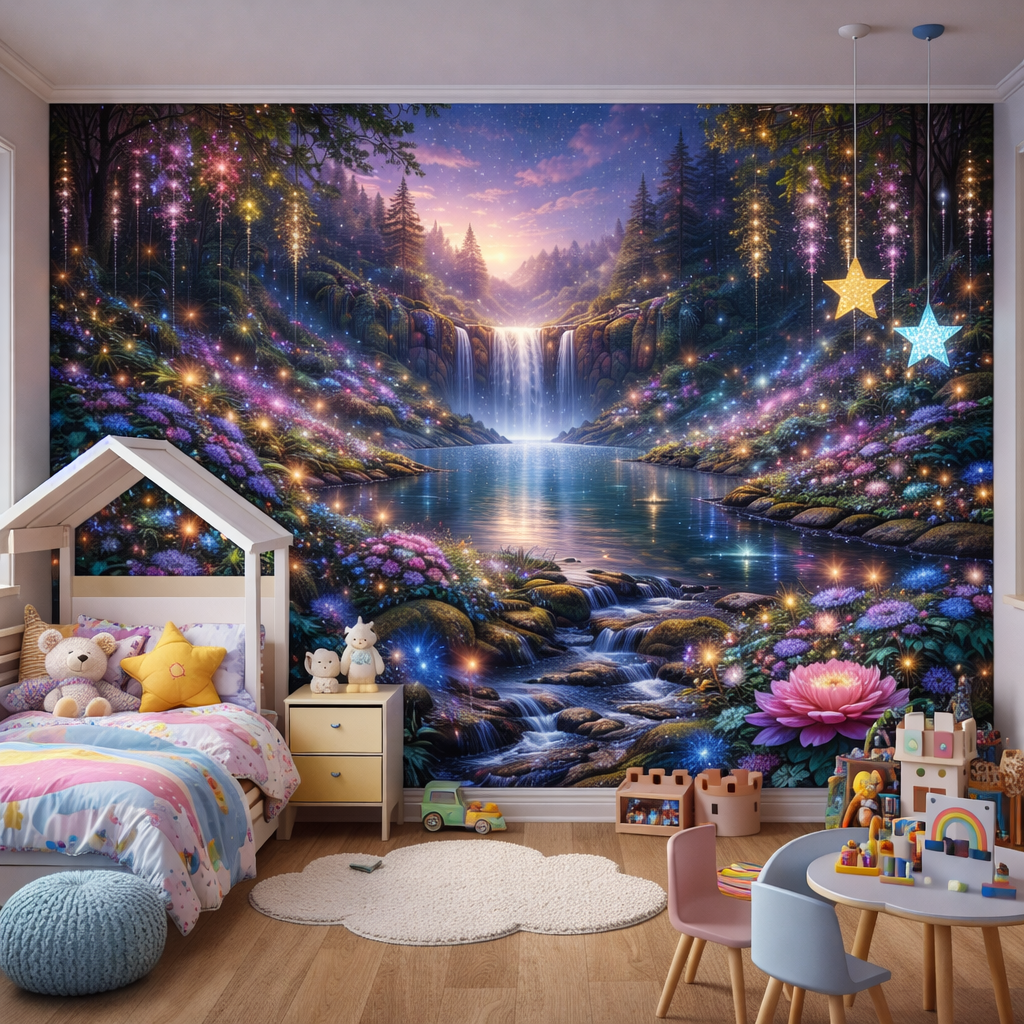 This magical waterfall and glowing floral design creates a calming, storybook atmosphere — perfect for luxury homes, boutique hotels, learning spaces and special educational environments.