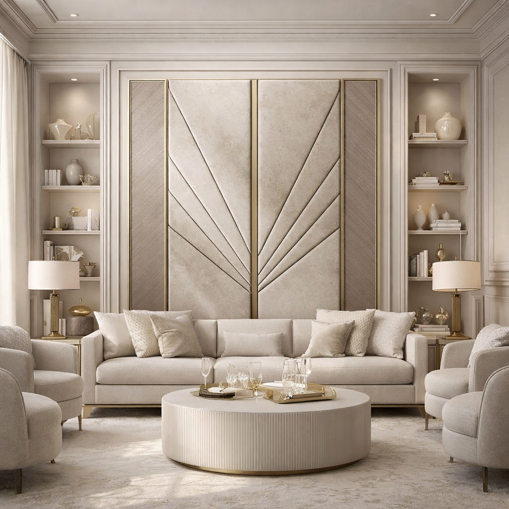 Bring refined glamour into your space with this striking Art Deco–inspired design. Clean geometric lines, soft stone textures, and elegant metallic accents combine to create a bold yet balanced visual statement.