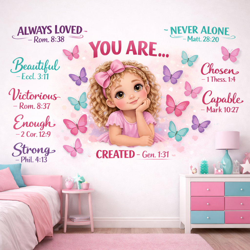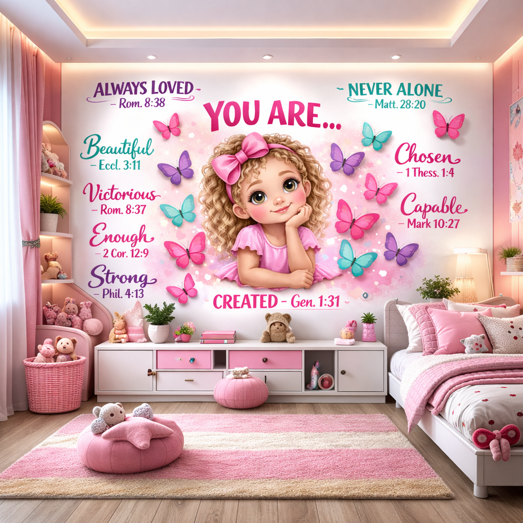 Soft pastels, butterflies, and a sweet calming character create a peaceful atmosphere perfect for children’s bedrooms, nurseries, pre-schools, early years classrooms, learning corners, special educational spaces, and soft play areas.
