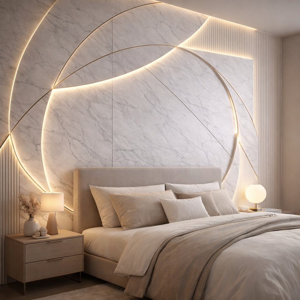 This elegant marble-inspired design blends soft stone textures with flowing illuminated curves, creating a calm yet powerful visual rhythm. The gentle geometry and warm light accents elevate any space, delivering a timeless, architectural feel that speaks of quiet opulence.