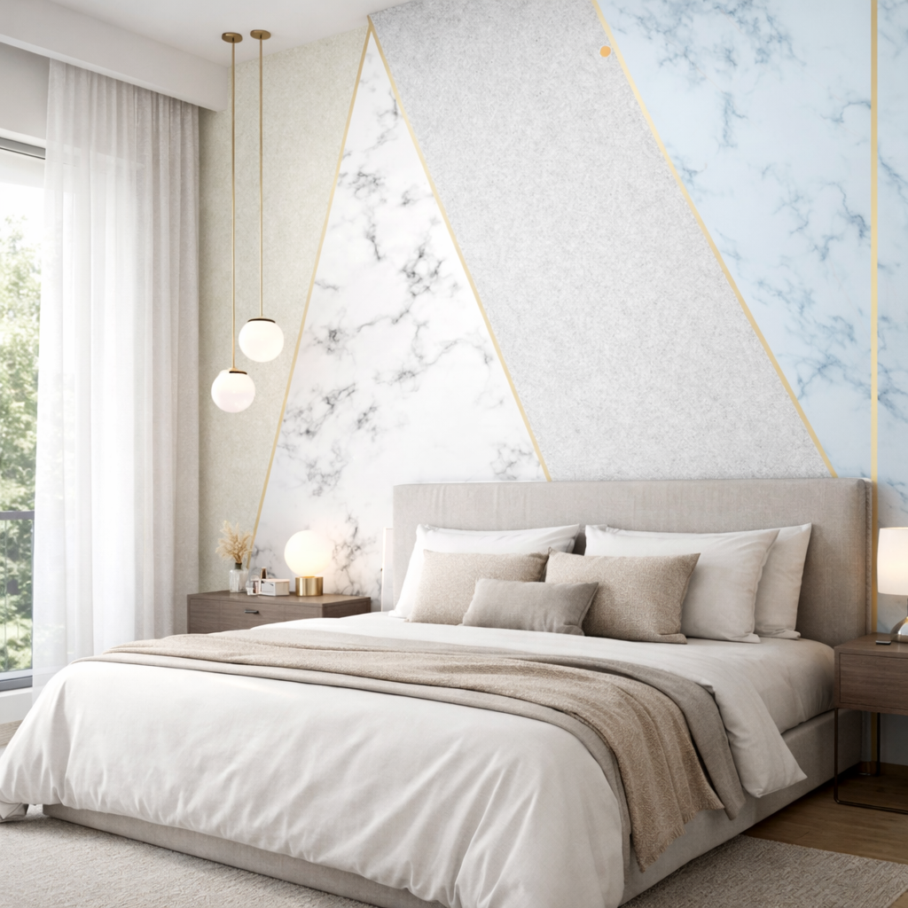 Clean geometry meets refined marble textures in this striking, contemporary design. Soft neutrals, cool stone tones, and elegant gold accents create a sense of balance, luxury, and architectural calm.