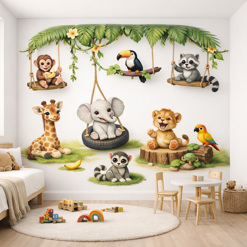Bring joyful safari magic into children’s spaces with this beautifully illustrated jungle mural. Featuring playful animals, tropical leaves and soft calming tones, it creates a warm, inspiring atmosphere for nurseries, pre-schools, bedrooms, boutique hotels, soft play areas and luxury family spaces.