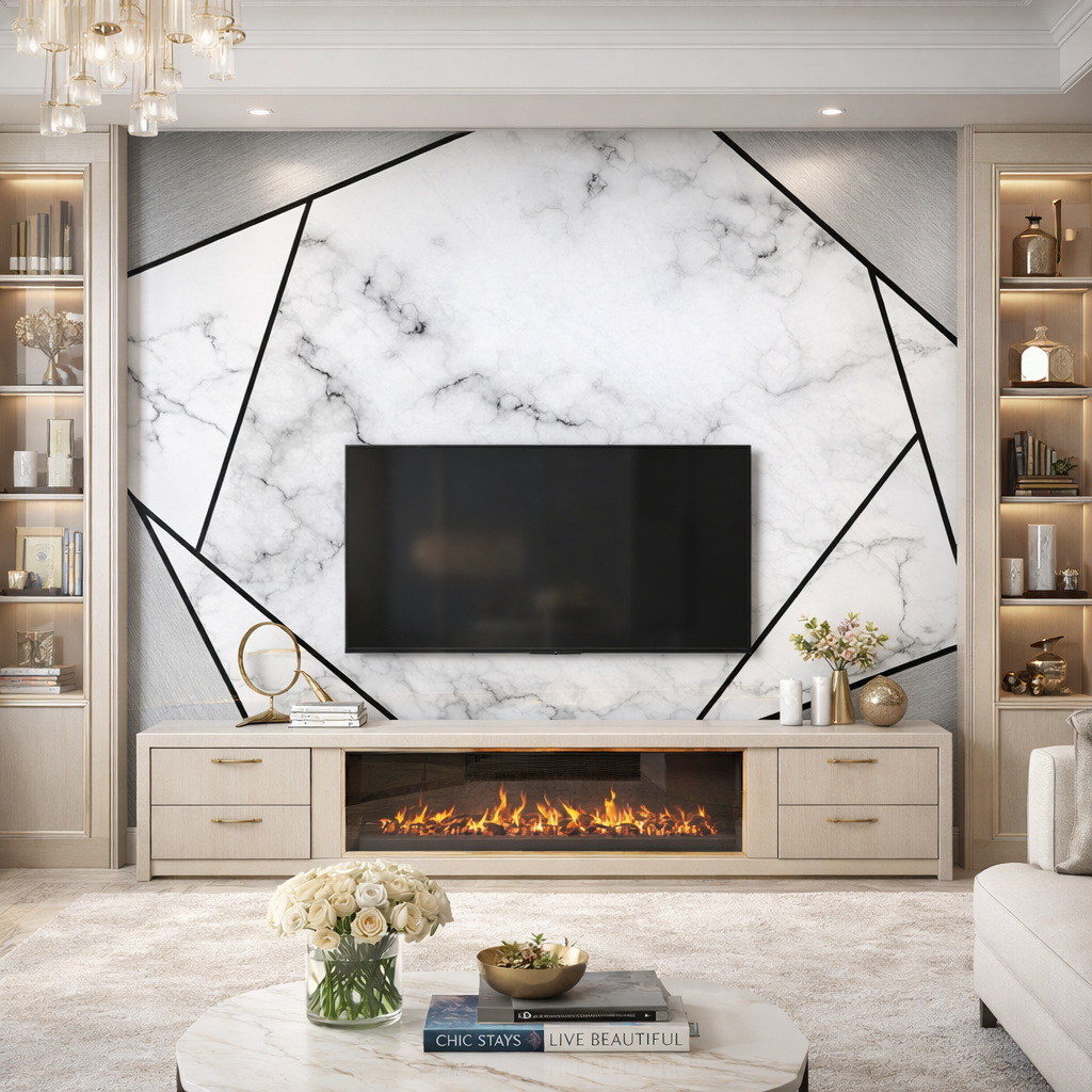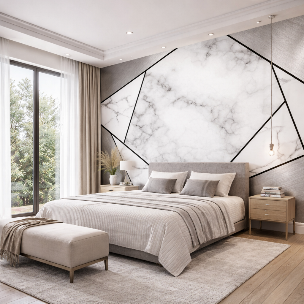 A bold expression of modern luxury, this geometric marble wallpaper mural blends clean architectural lines with soft white marble textures to create a refined, high-end finish. Designed to elevate spaces instantly, it brings balance, sophistication, and visual depth to both commercial and residential interiors.