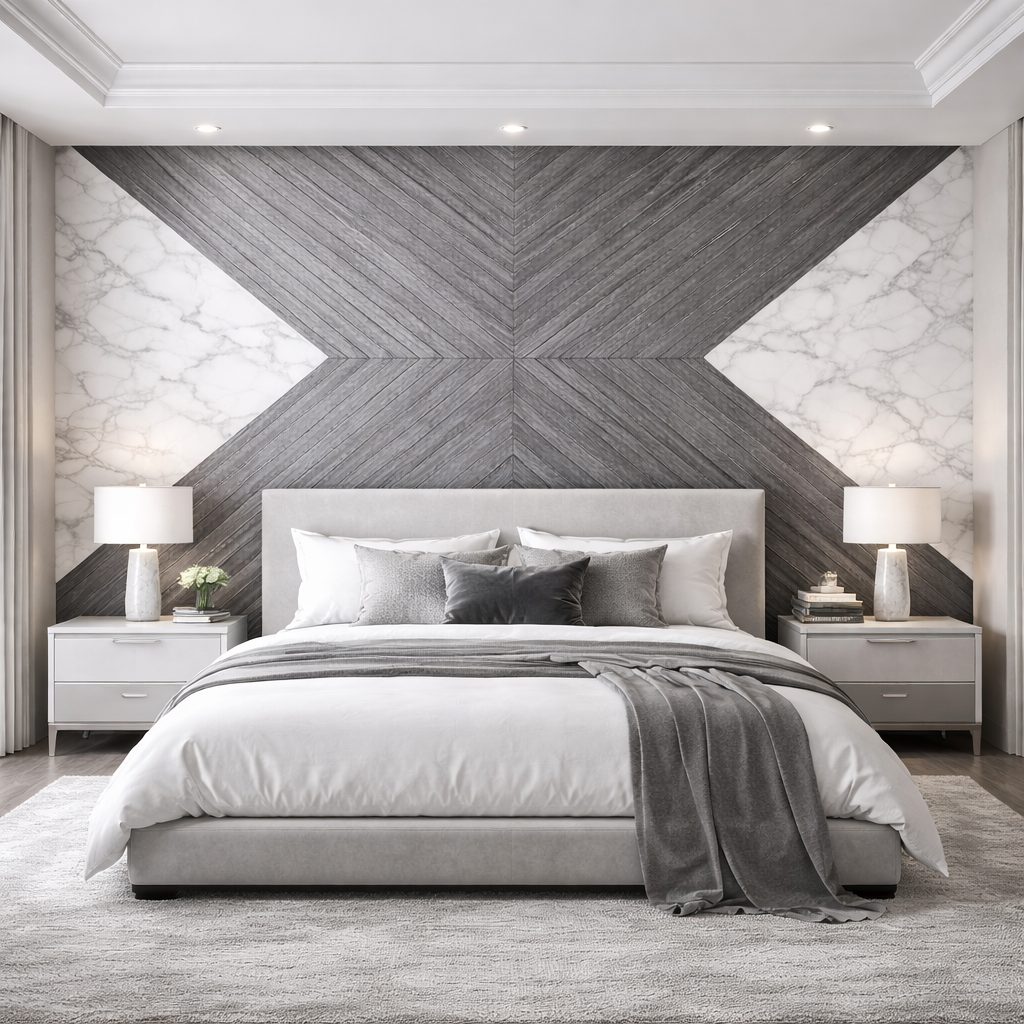 This bespoke wallpaper mural blends refined grey chevron textures with subtle marble accents, creating a powerful geometric flow that elevates any interior. Designed to feel architectural, calm, and confident, it brings depth and sophistication without overpowering the space.
