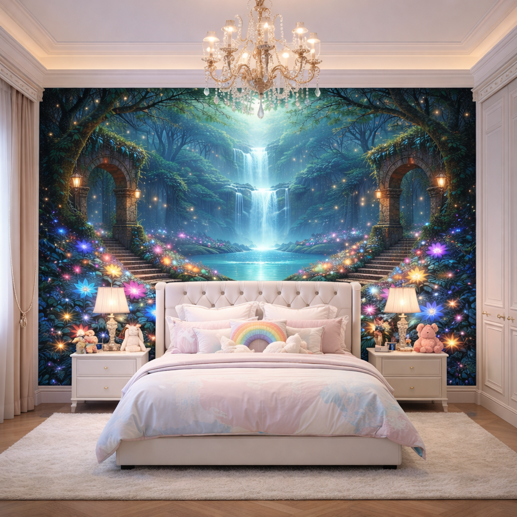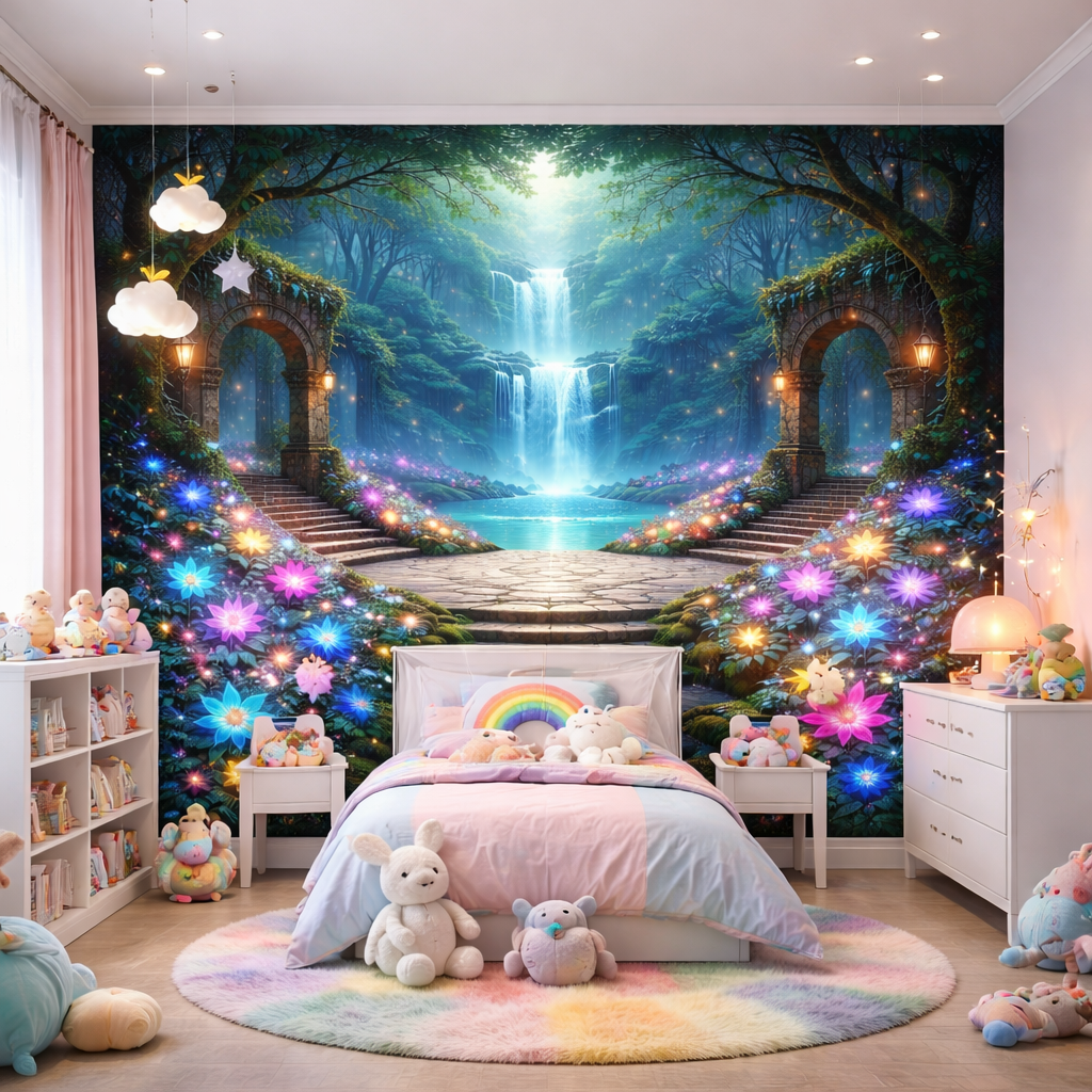 Transform your walls into a magical waterfall garden filled with glowing flowers and peaceful forest charm.