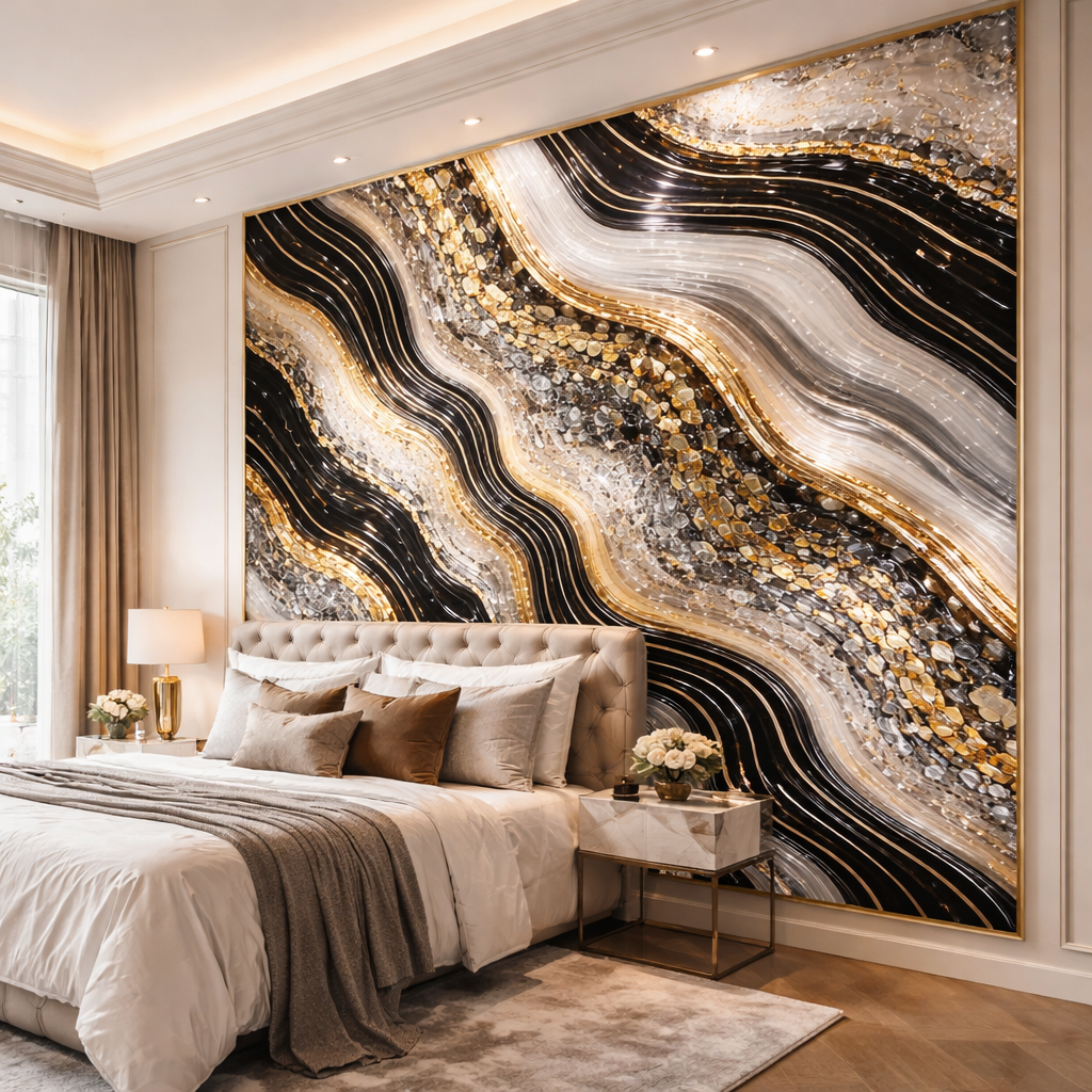 This striking design blends deep black layers with molten gold veins and crystal-like textures, creating a bold, high-end aesthetic that instantly elevates any space. Inspired by natural stone formations and modern luxury interiors, it delivers drama, depth, and elegance in one seamless look.