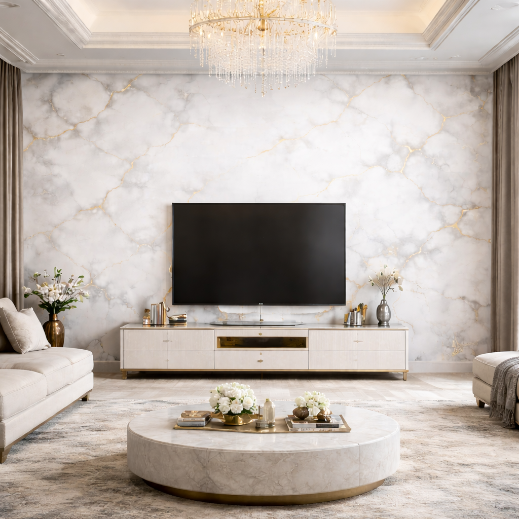 Elevate your space with timeless elegance. This refined marble-inspired design blends soft white stone textures with delicate gold veining, creating a calm yet opulent statement. Perfect for luxury hotels, upscale homes, boutiques, offices, spas, and showrooms, this wallpaper delivers a premium, high-end finish without overpowering the space.