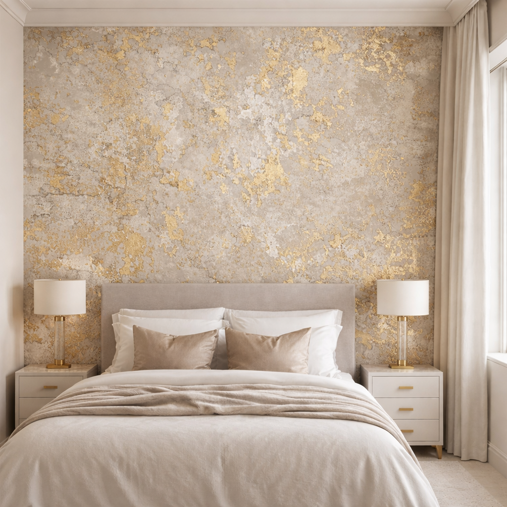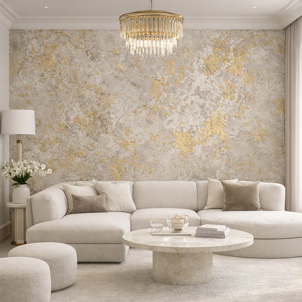 Soft stone textures layered with brushed gold accents create a refined, modern statement. This design brings understated glamour and warmth, making walls feel elevated without overpowering the space.