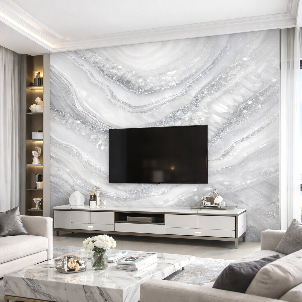 This design blends soft marble-like waves with shimmering crystal textures, creating a refined, high-end look that instantly elevates any interior. Subtle, elegant, and timeless, it’s perfect for spaces that demand sophistication without overpowering the room.
