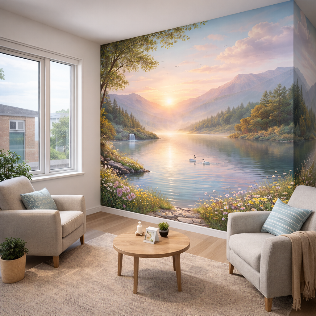 Create a sense of calm, hope, and quiet luxury with this serene lakeside mural. Soft sunrise tones, gentle water reflections, and natural greenery work together to reduce stress and anxiety—making it ideal for healthcare environments where patients need comfort, reassurance, and emotional balance.