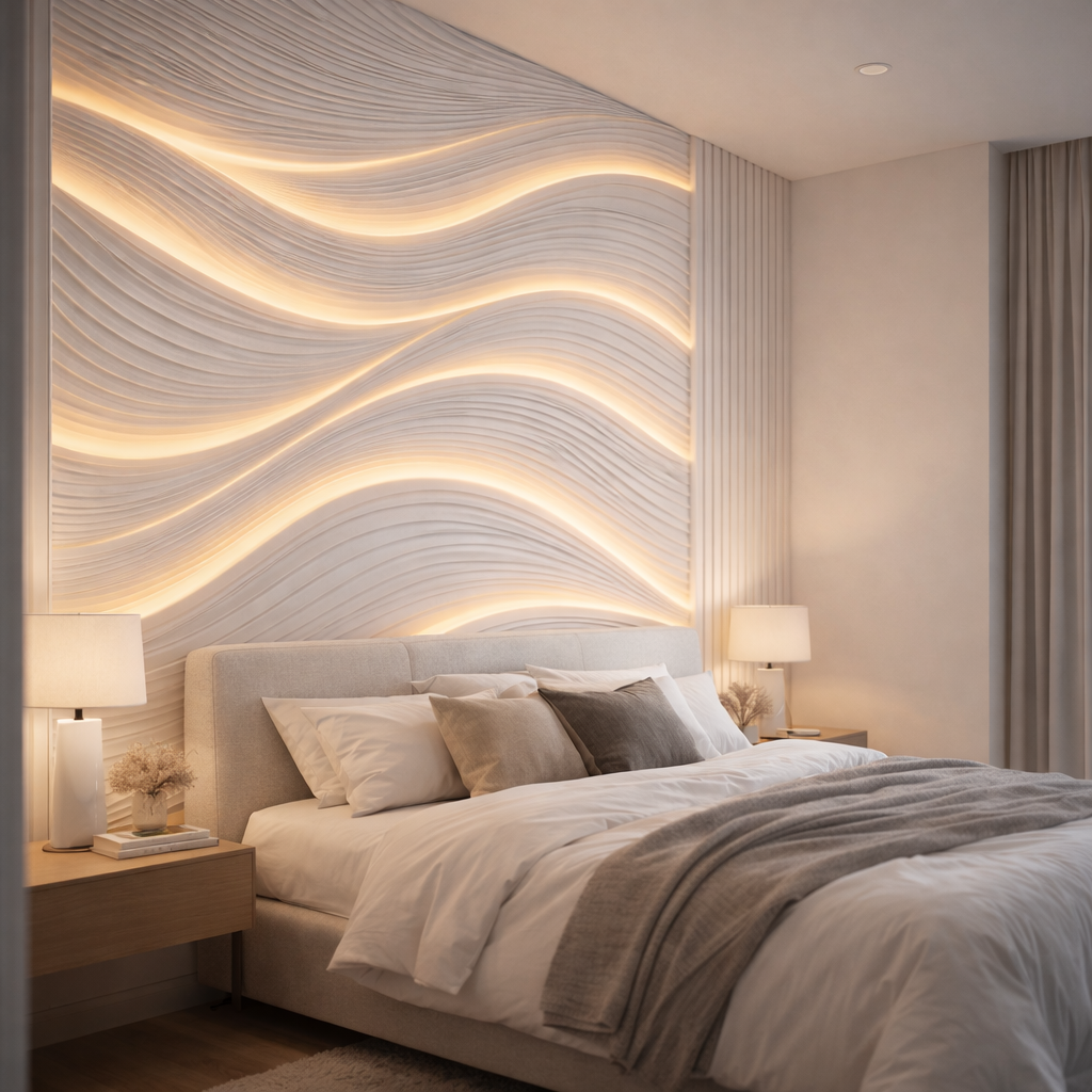 Soft, sculptural waves flow across the surface, illuminated with a warm, elegant glow. This design brings calm movement and modern luxury into any space, creating an architectural statement without overwhelming the room.