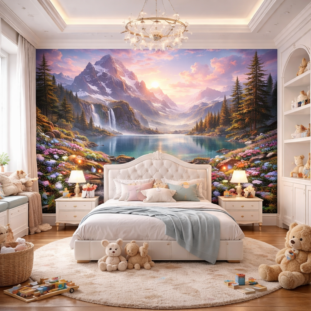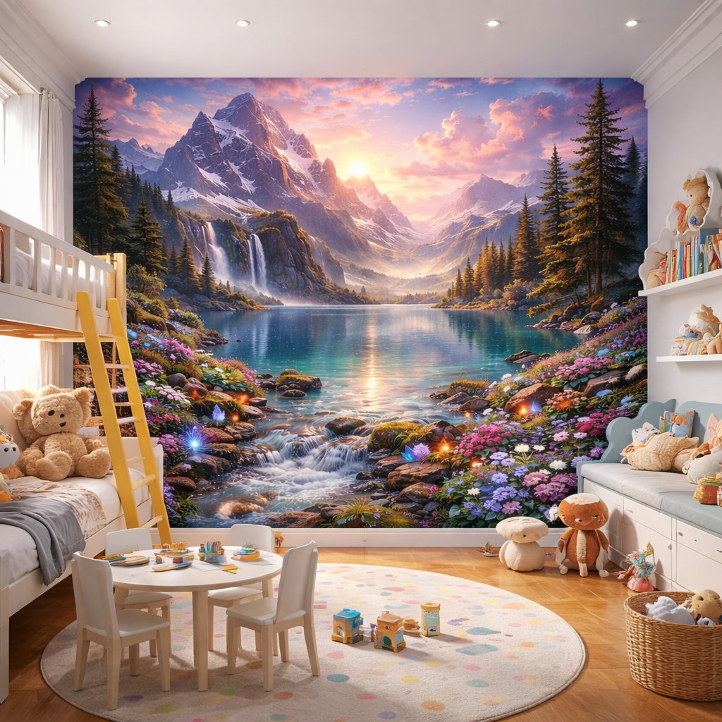 Transform their space into a magical mountain sunset with sparkling waters and glowing forest lights.