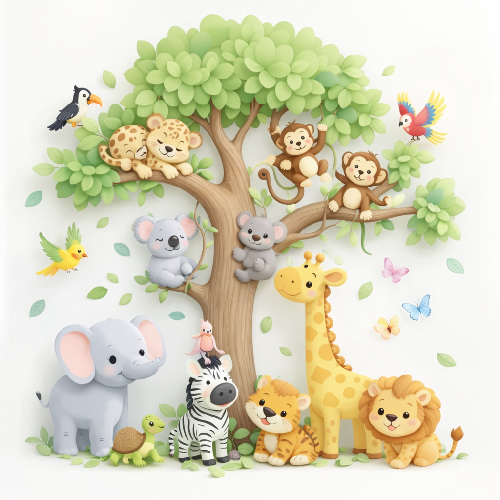A charming safari tree scene filled with adorable jungle animals, designed to create a calm, joyful and imaginative space for little ones.