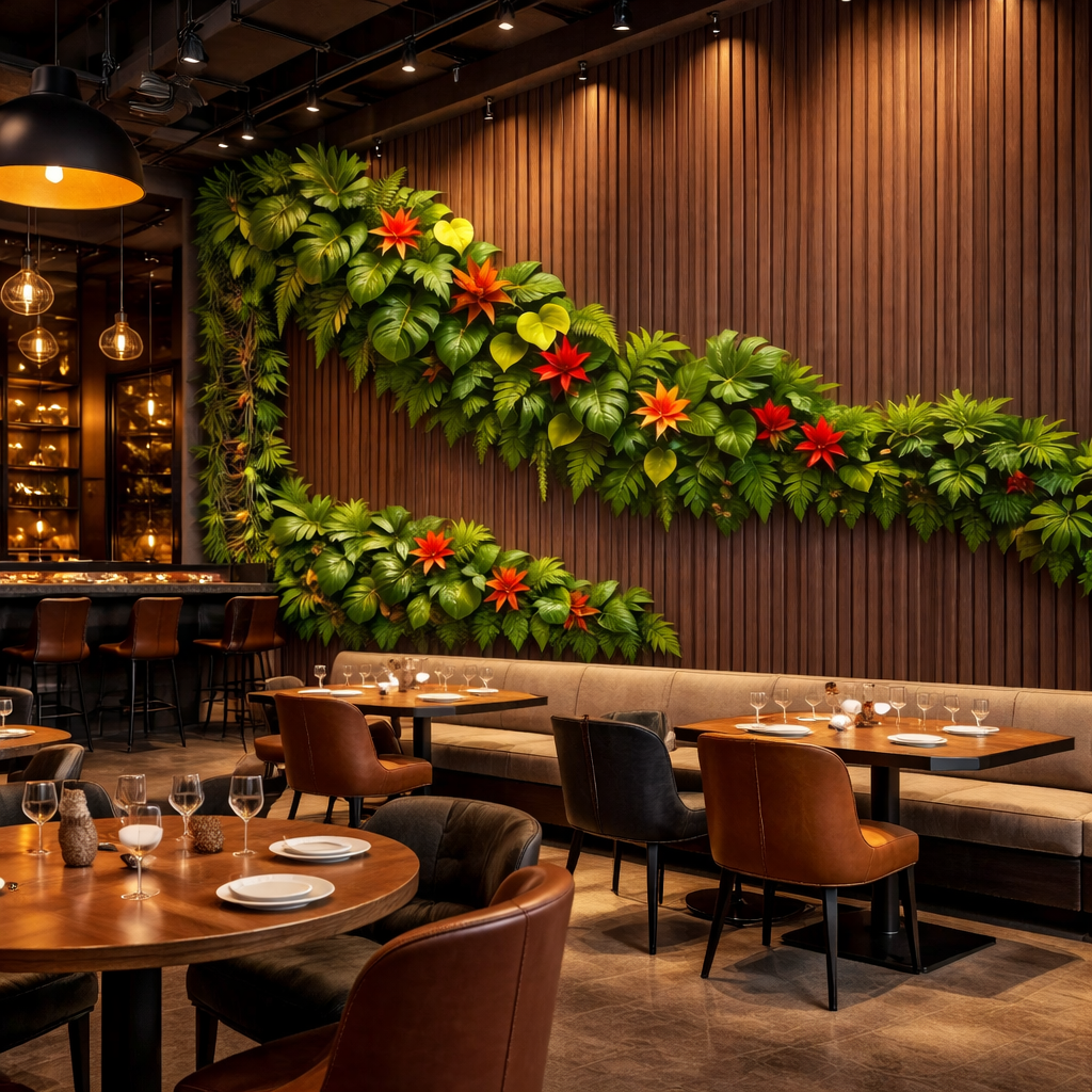 Bring refined nature indoors with this luxury artificial foliage wall mural. Designed with rich layered greenery, warm timber tones, and bold floral accents, this wallpaper creates an instant statement of elegance and calm. Perfect for hotels, luxury homes, restaurants, offices, spas, lobbies, lounges, and commercial interiors, it delivers high-end visual impact without maintenance.