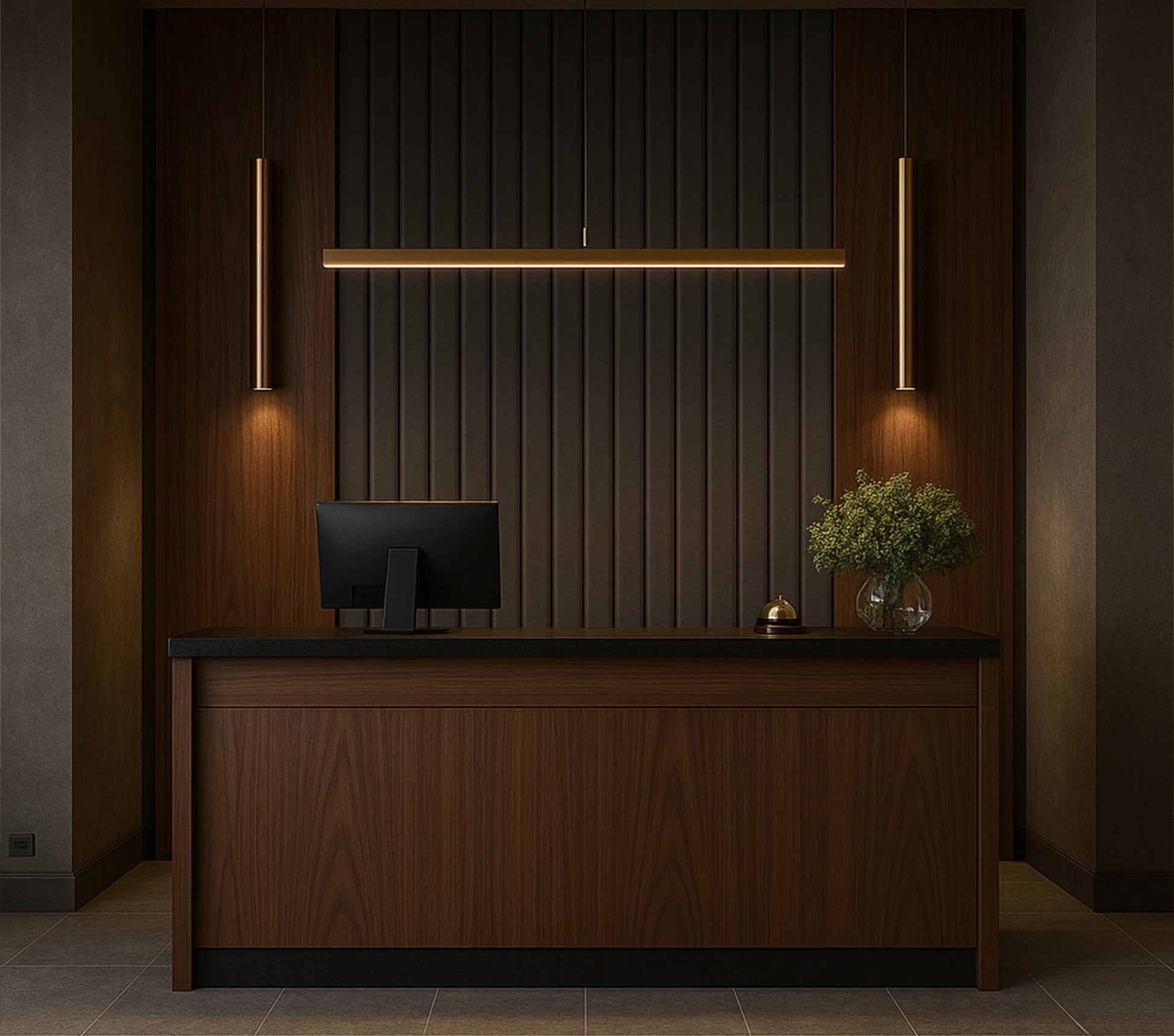 This bespoke wallpaper mural features deep charcoal vertical panels framed by rich wood tones and subtle metallic accents — creating a calm, architectural rhythm that feels exclusive and timeless.