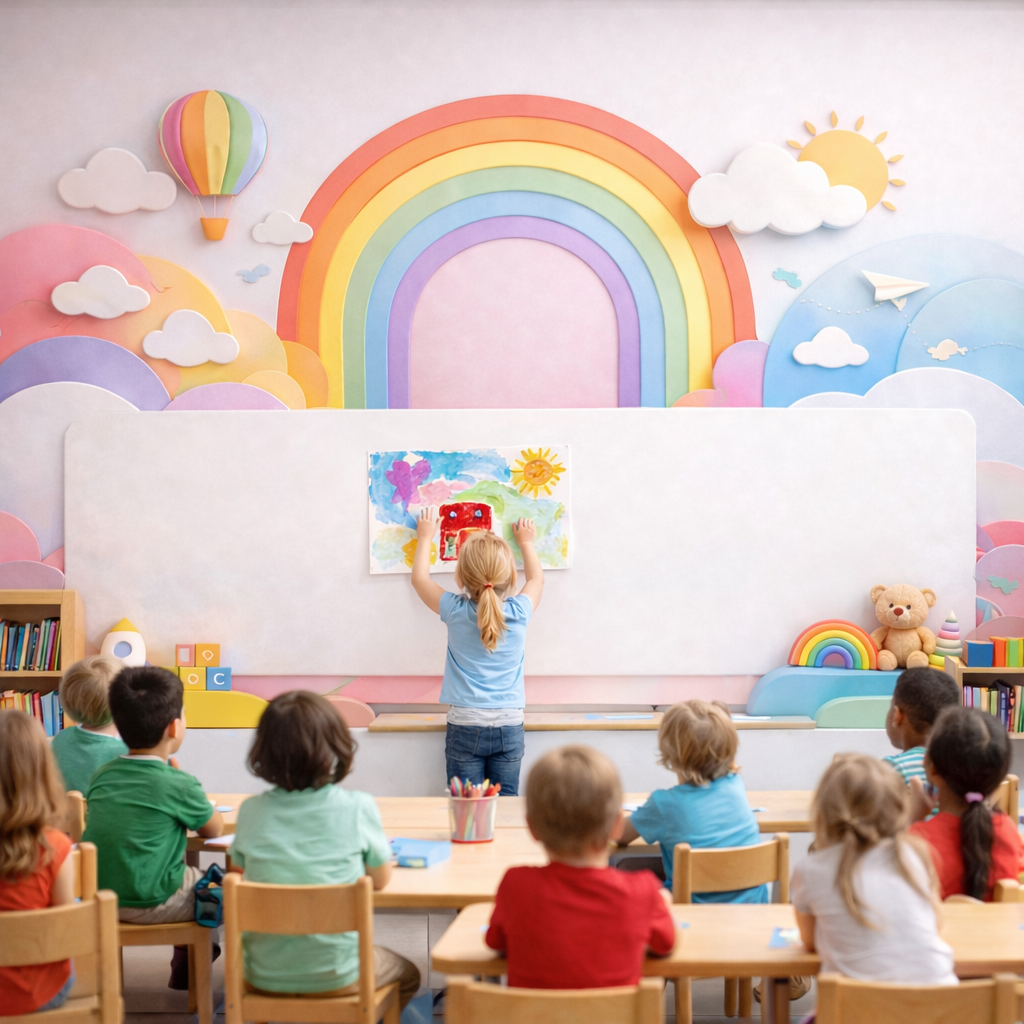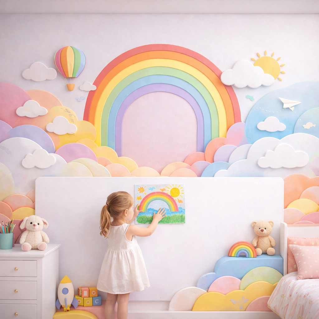 Transform nurseries and learning spaces with a soft, modern rainbow sky that inspires creativity while keeping walls beautifully tidy.