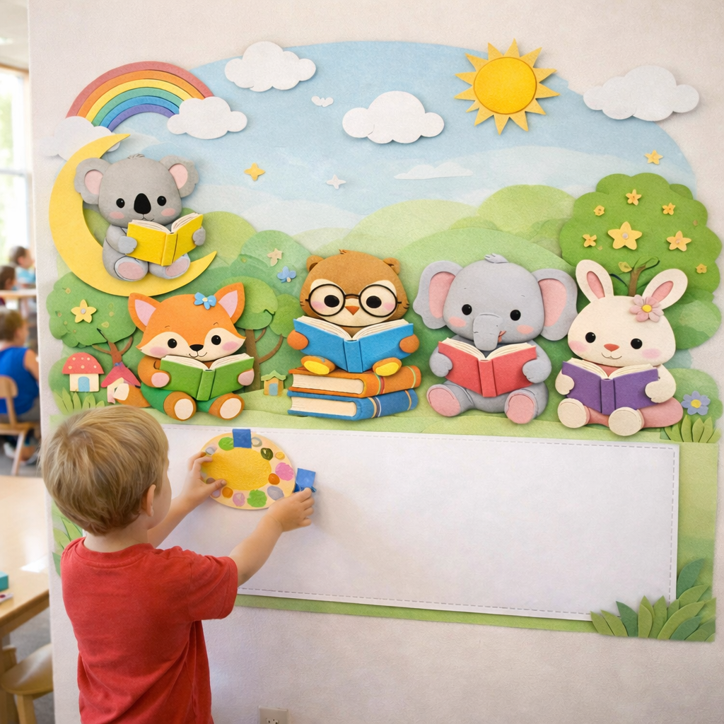 Bring learning to life with this enchanting woodland reading scene, where adorable animal friends sit beneath rainbows and sunshine sharing their favourite books. Designed to inspire imagination, calm focus, and creativity, this charming nursery mural transforms any space into a joyful learning haven.