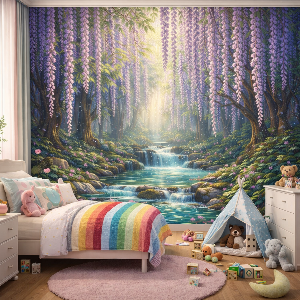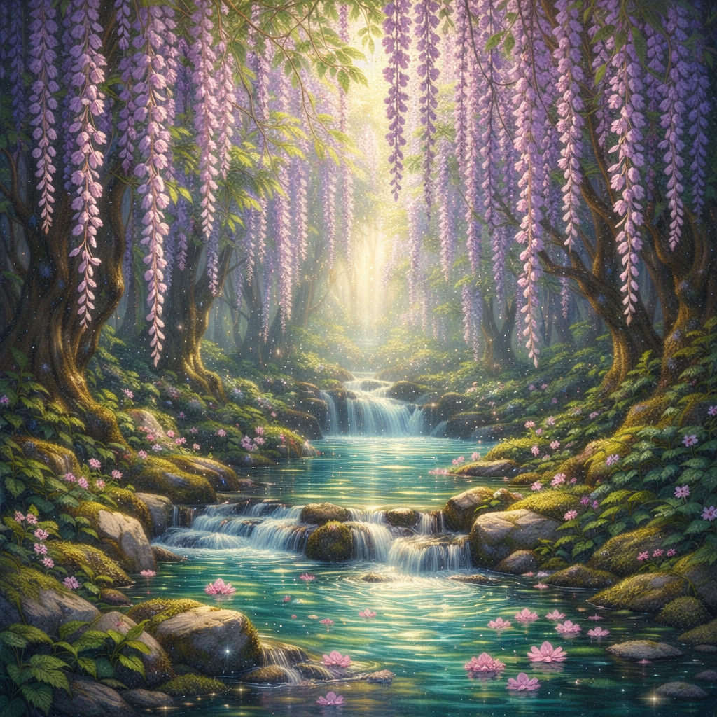 Now imagine a calming forest waterfall beneath cascading wisteria blossoms. Soft petals float across tranquil waters, creating a magical, storybook setting that inspires imagination and learning.